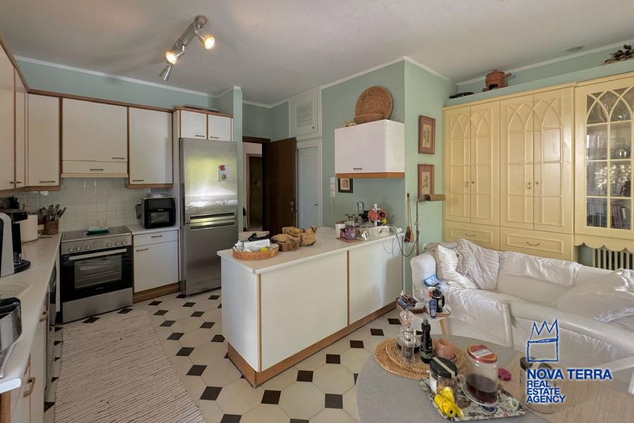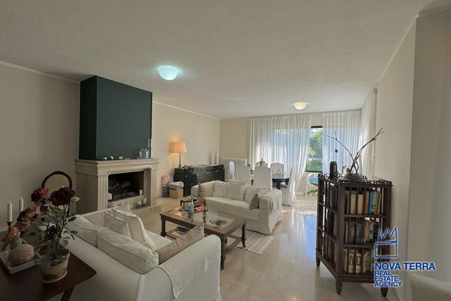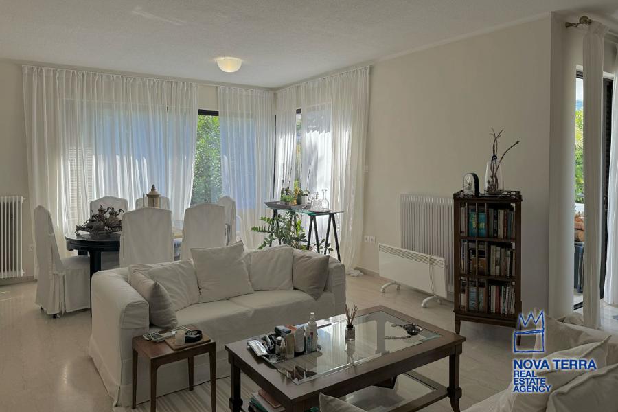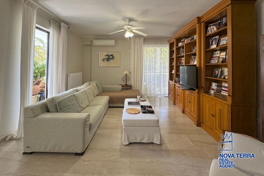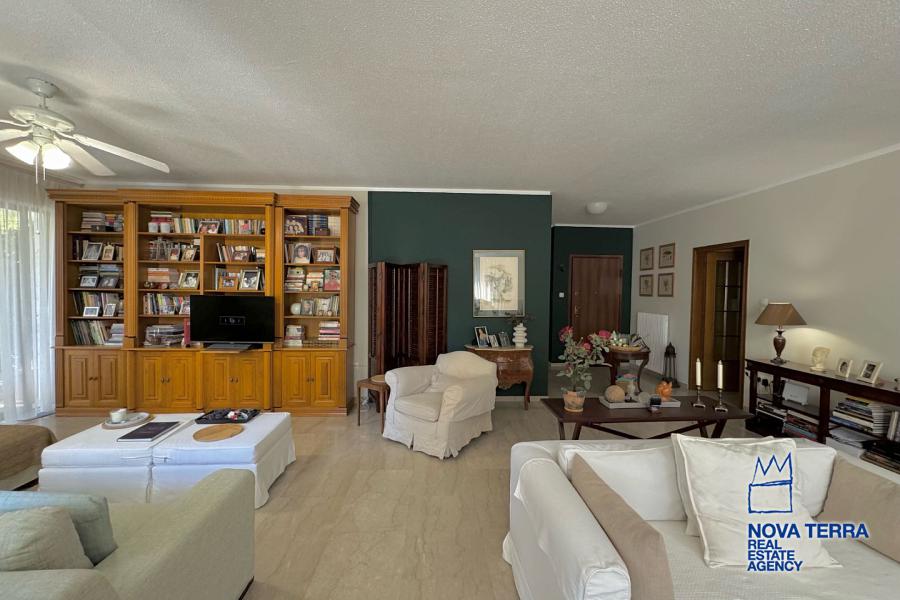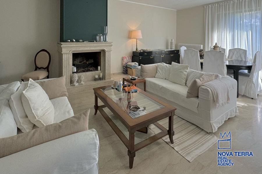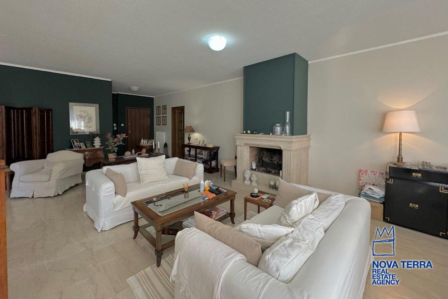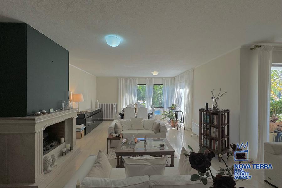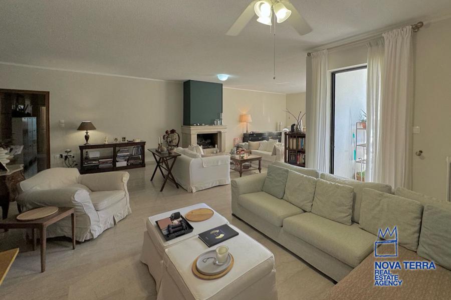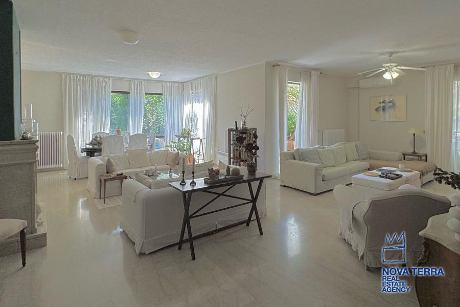 Αποτελείται από έναν μεγάλο κεντρικό χώρο, με δύο άνετα καθιστικά, εκ των οποίων το ένα με τζάκι και μια αριστοκρατική τραπεζαρία. Διαθέτει μεγάλα παράθυρα και μπαλκονόπορτες περιμετρικά που το καθιστούν εξαιρετικά φωτεινό και του προσφέρουν πρόσβαση σε 2 ευρύχωρα μπαλκόνια. Ο χώρος αυτός διαθέτει ένα μοντέρνο w/c ξένων και έχει πρόσβαση στην κουζίνα. Η κουζίνα είναι κλειστή και ανεξάρτητη, αρκετά ευρύχωρη, με τραπεζαρία, καθιστικό και δωμάτιο-αποθήκη στο εσωτερικό της. Συνδέεται με το μεγάλο μπαλκόνι του σαλονιού και μια ακόμα μικρή βεράντα. Το μεγάλο μπαλκόνι διαθέτει χώρο για τραπεζαρία αλλά και ένα επιπλέον καθιστικό.