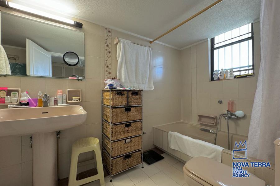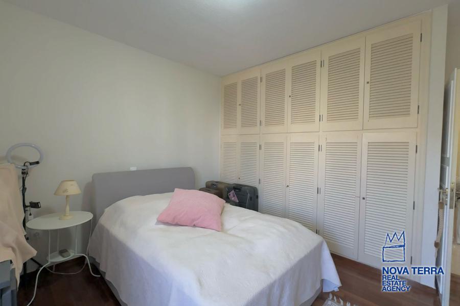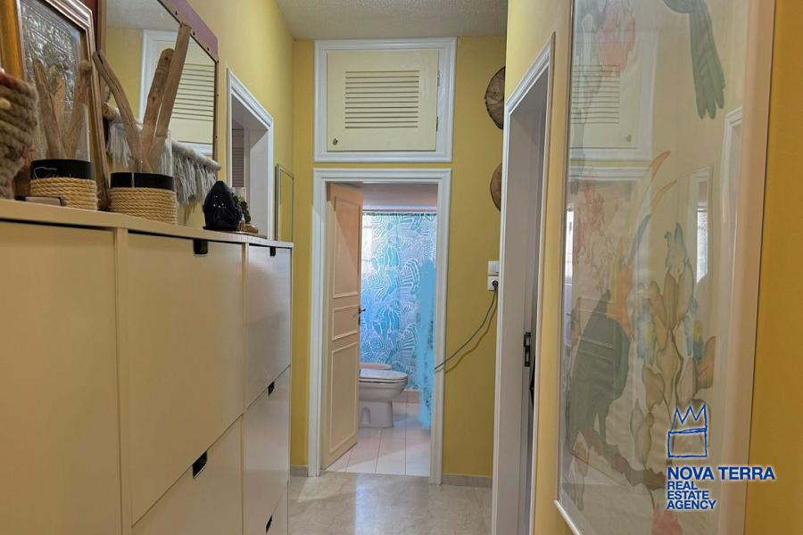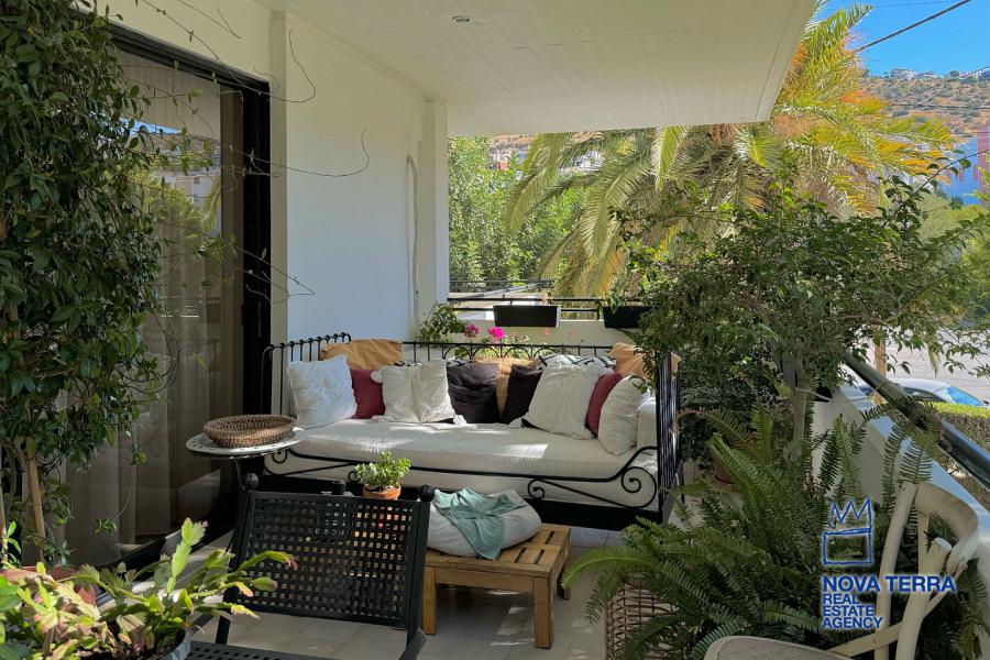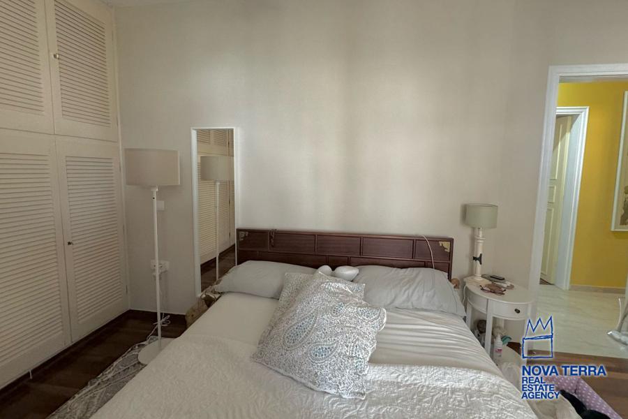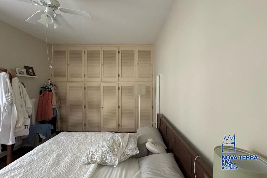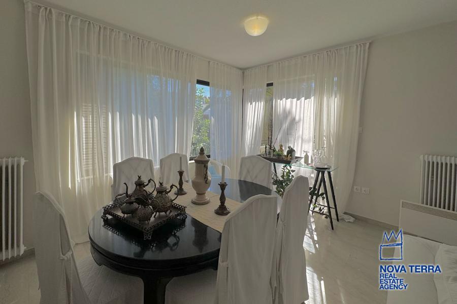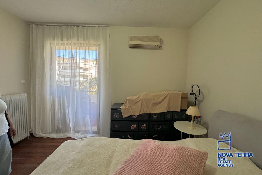 Εσωτερικά, υπάρχει διάδρομος που οδηγεί στους ιδιωτικούς χώρους. Εκεί βρίσκονται 3 υπνοδωμάτια, εκ των οποίων το ένα μάστερ με ιδιωτικό μπάνιο και ένα ακόμα πλήρες μπάνιο για τα υπόλοιπα δωμάτια. Όλες οι κρεβατοκάμαρες έχουν πρόσβαση σε μπαλκόνια που βλέπουν σε καταπράσινο κήπο με γκαζόν και δέντρα. Η οικεία διαθέτει μαρμάρινα πατώματα στους κεντρικούς χώρους και ξύλινα στους ιδιωτικούς, κουφώματα αλουμινίου με διπλά τζάμια, πόρτα ασφαλείας, θυροτηλεόραση και ασανσέρ. Η θέρμανση είναι αυτόνομη πετρελαίου, ενώ διατίθενται επίσης κλιματιστικά για την ψύξη και ηλιακός θερμοσίφωνας με boiler για τη θέρμανση του νερού.