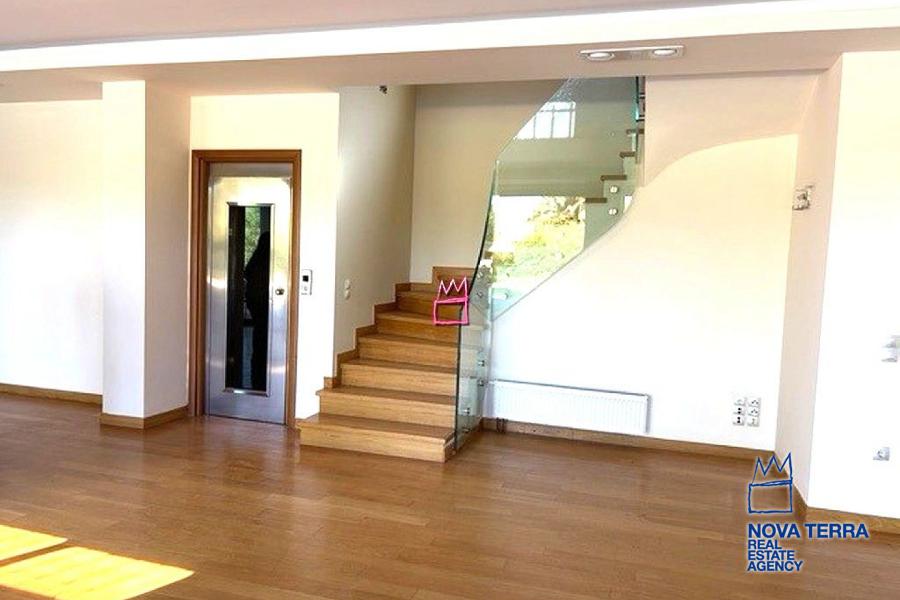 Αποτελείται από κύρια κατοικία 350 τ.μ. ισογείου, πρώτου και δευτέρου ορόφου, με τέσσερα υπνοδωμάτια master, κουζίνα 80 τ.μ., ασανσέρ και τζάκι.