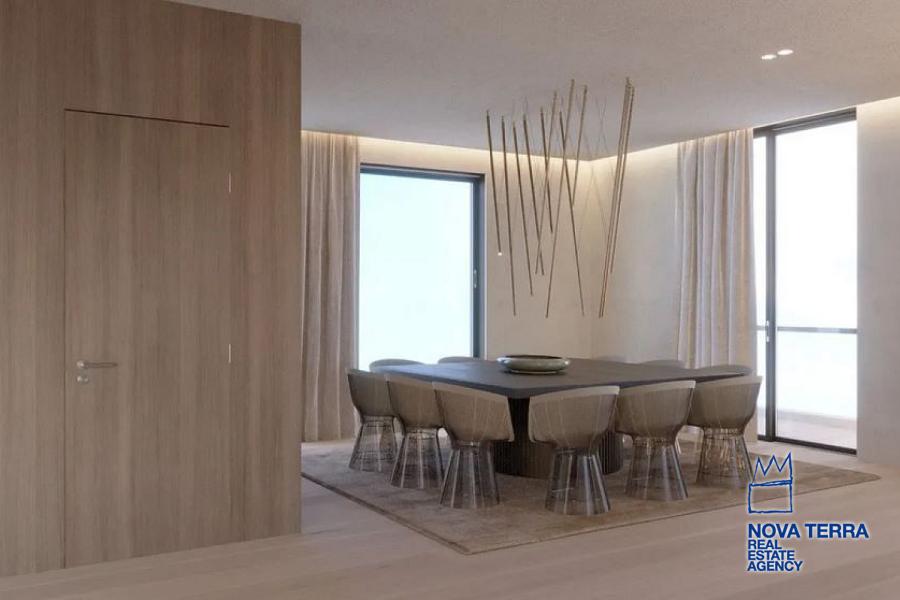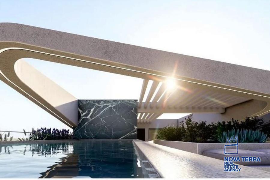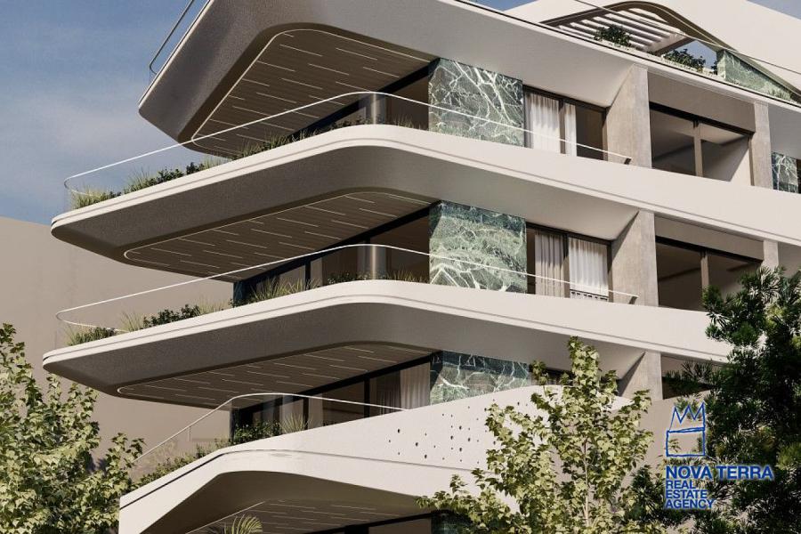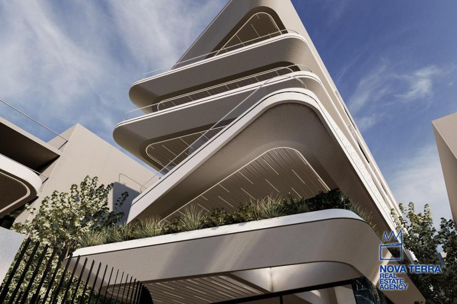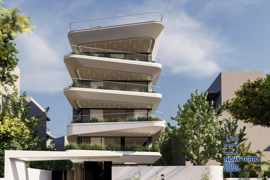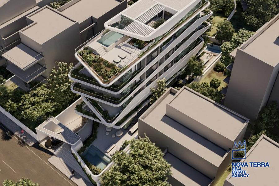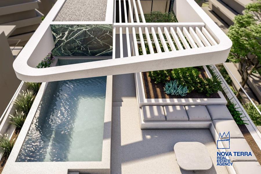 , Οροφοδιαμέρισμα 3ου ορόφου προς πώληση συνολικού εμβαδού 156,31 τ.μ., Minimal Design σε περιοχή με άνοιγμα και φαρδύ δρόμο και ωραία θέα στον κήπο - πισίνα του κτιρίου, με εξαιρετικό προσανατολισμό, σε γωνιακό οικόπεδο.