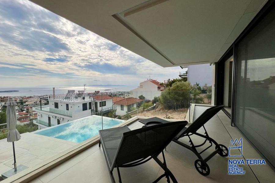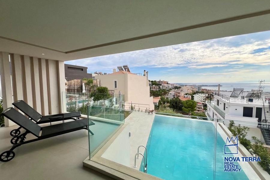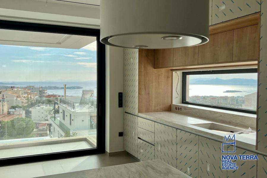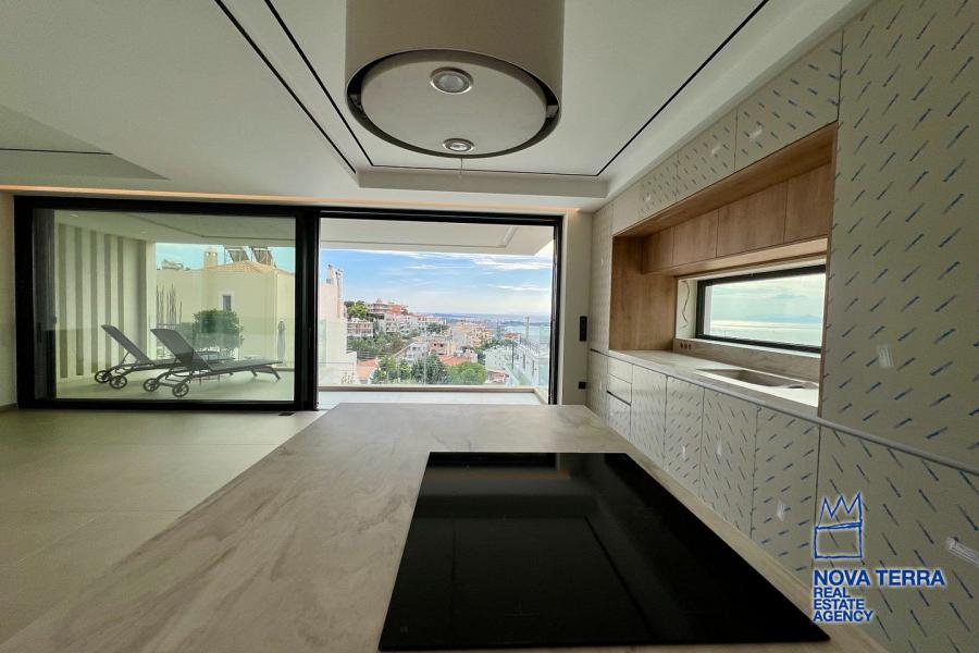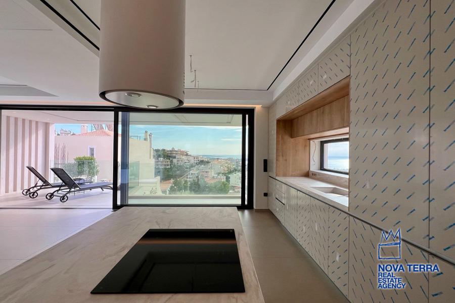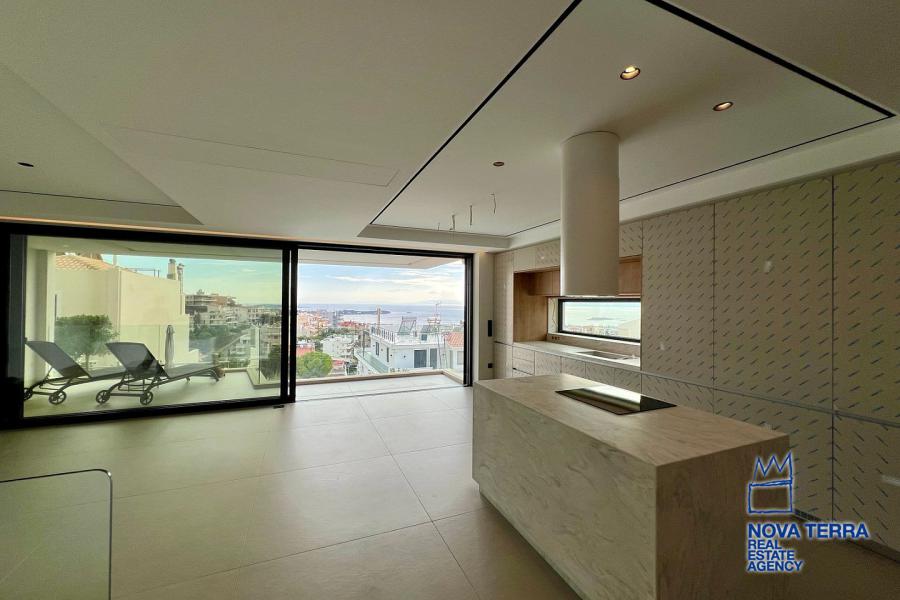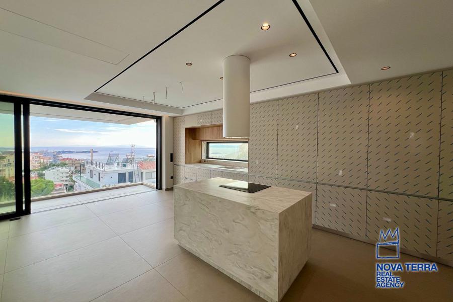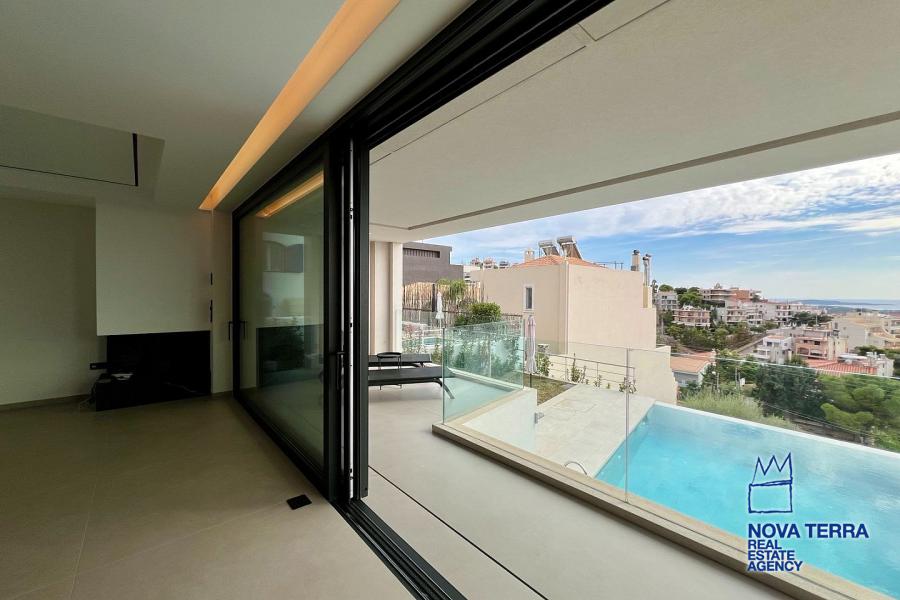 Εσωτερικά, τα υλικά χρώματος και επίπλων σε συνδυασμό με το δάπεδο, την κουζίνα και τον χώρο εξωτερικά, δημιουργούν μια φρέσκια, ευχάριστη και αρμονική ατμόσφαιρα, τονίζοντας ιδιαίτερα τον μοντέρνο και minimal αρχιτεκτονικό σχεδιασμό του διαμερίσματος. Περιμετρικά μεγάλα ανοίγματα επιτρέπουν την διάχυση φυσικού φωτισμού. Στο σαλόνι υπάρχει ενεργειακό τζάκι, ενώ ο χώρος θερμαίνεται με σύστημα Ενδοδαπέδιας θέρμανσης και χρήση fan coil και αντλιών θερμότητας.