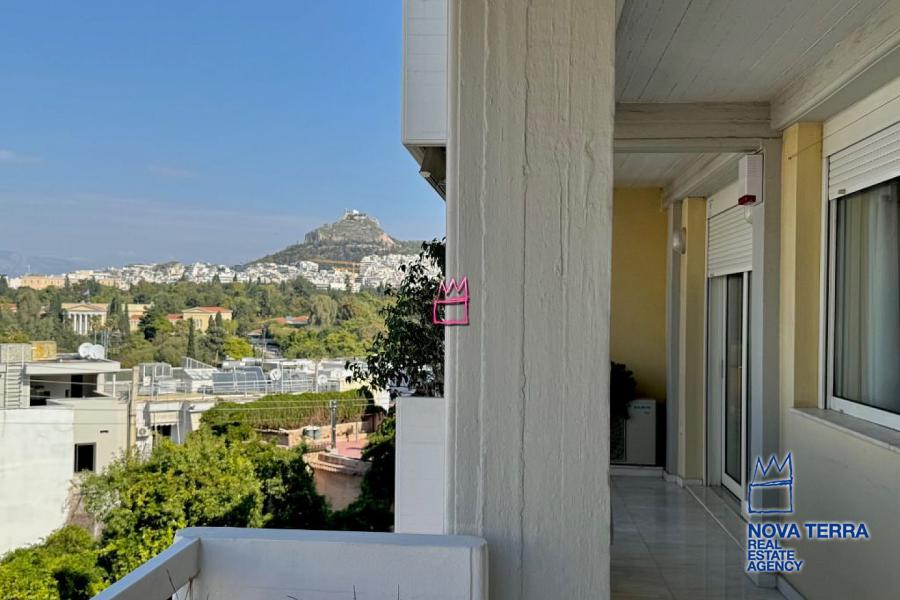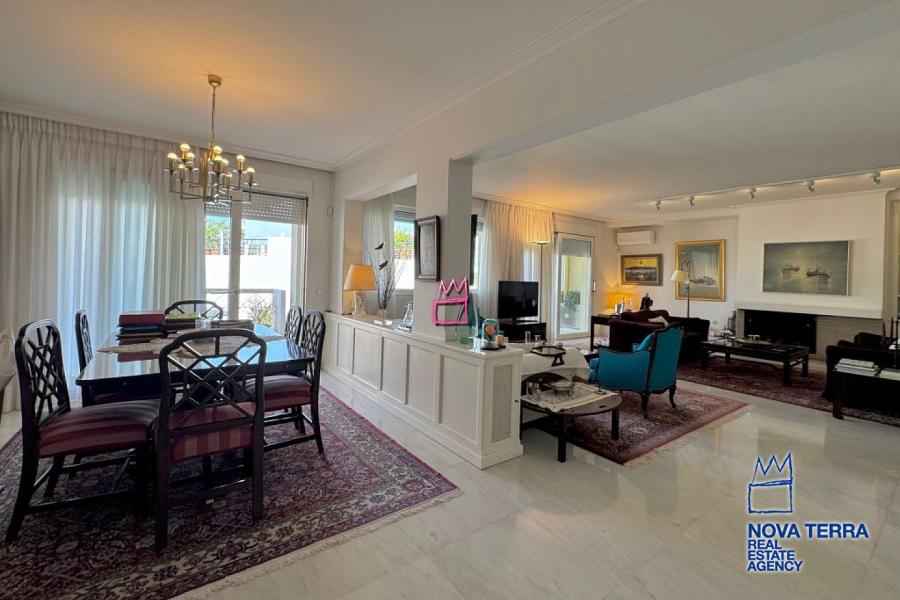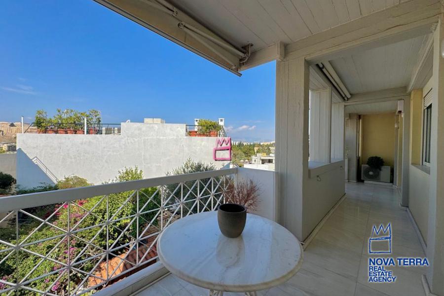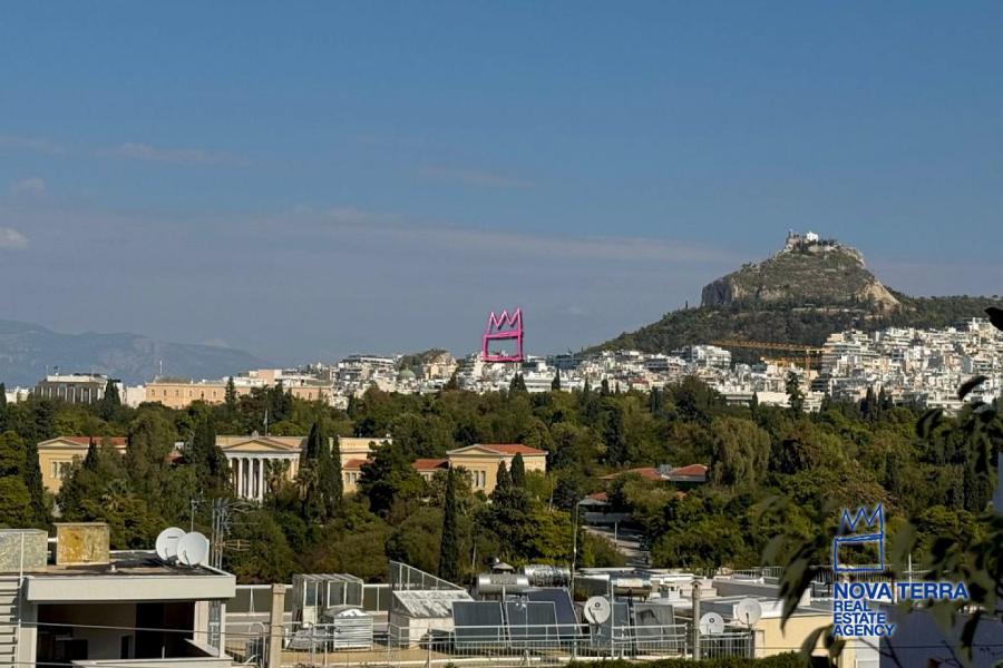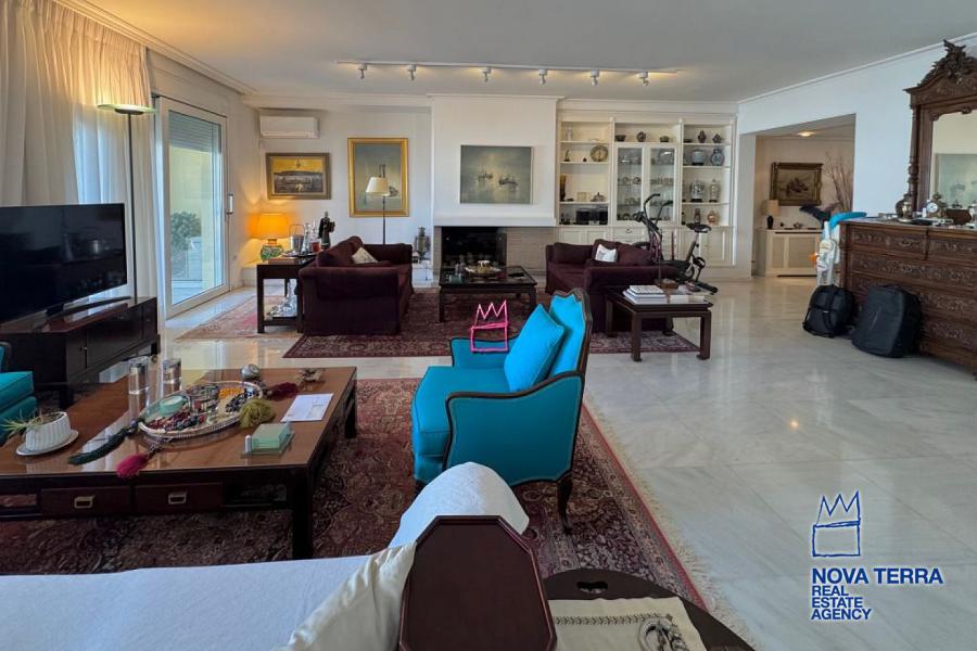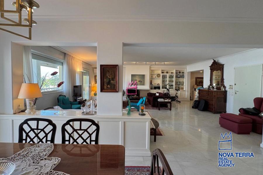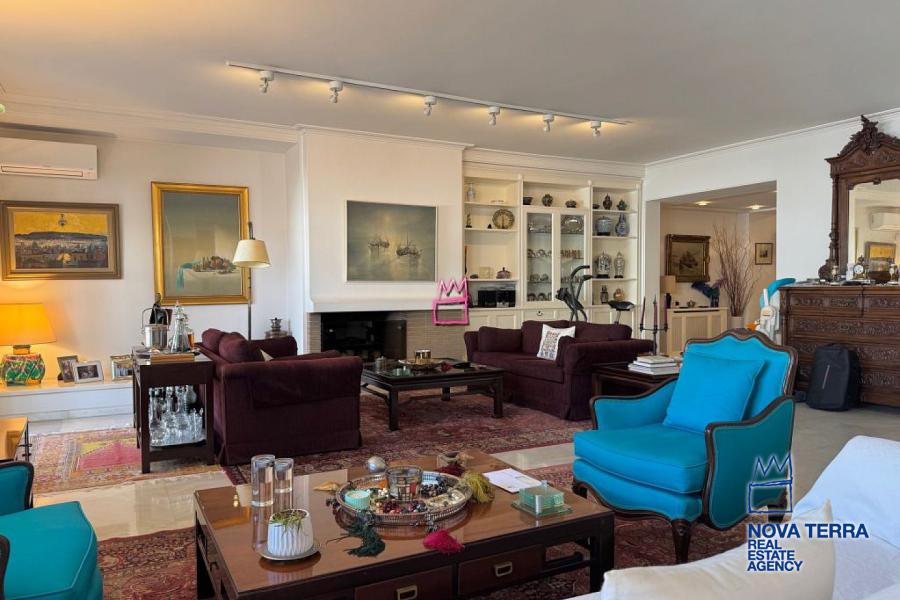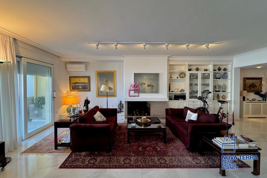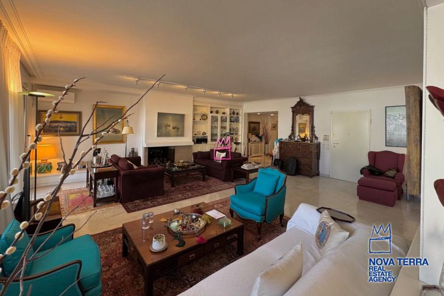 Μπαίνοντας μέσα συναντάμε έναν ευρύχωρο χώρο που φιλοξενεί το σαλόνι με τζάκι και Πεντελικό μάρμαρο στα δάπεδα και τραπεζαρία. Απολαμβάνεις από το μεγάλο μπροστινό μπαλκόνι την θέα προς την Ακρόπολη και το Λυκαβηττό. Συνεχίζοντας συναντάμε μια ευρύχωρη κουζίνα πλήρως εξοπλισμένη με ηλεκτρικές συσκευές Miele. Το διαμέρισμα έχει 4 υπνοδωμάτια και εκ των οποίων το ένα είναι master, έχει άλλο ένα μπάνιο και w/c για τους καλεσμένους.