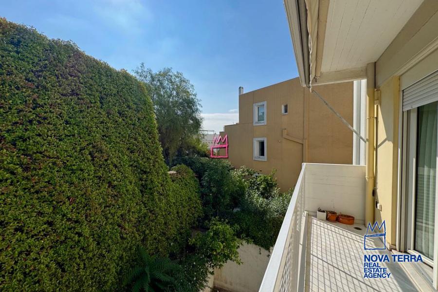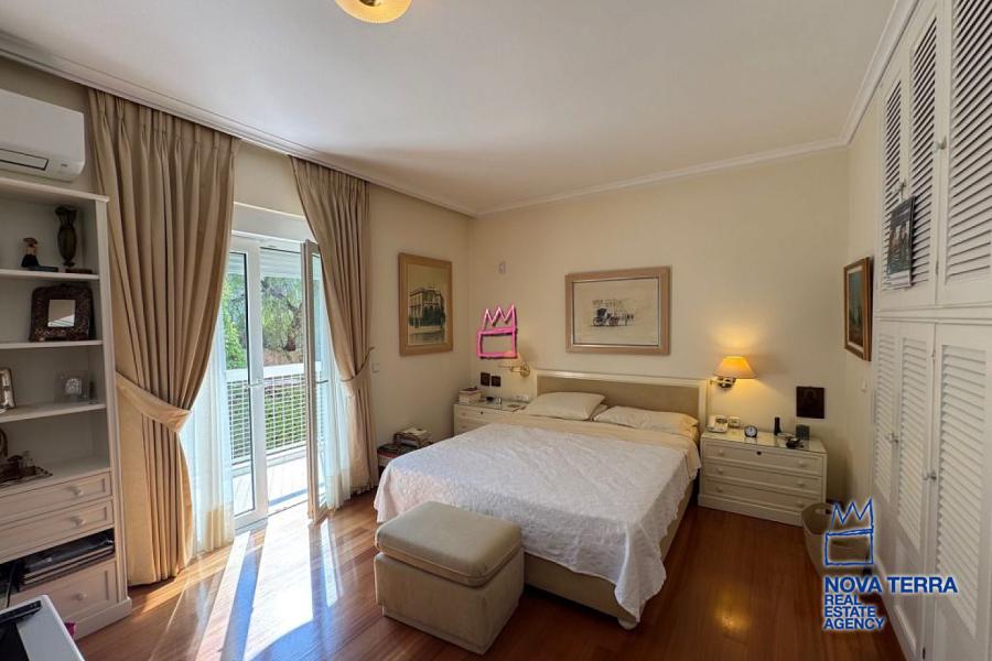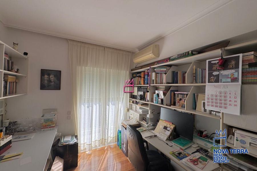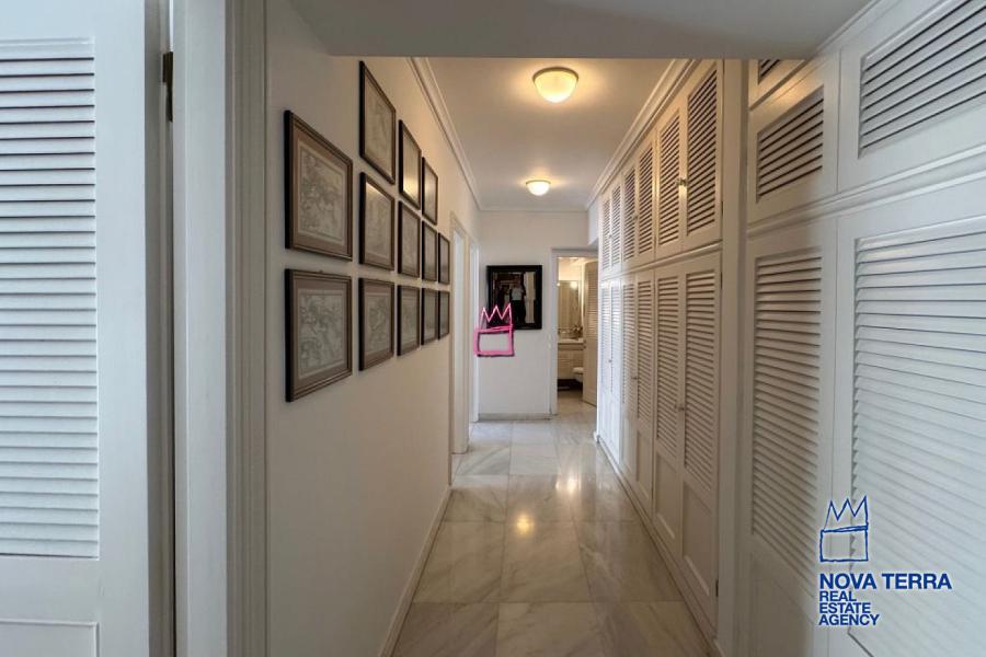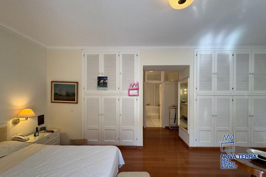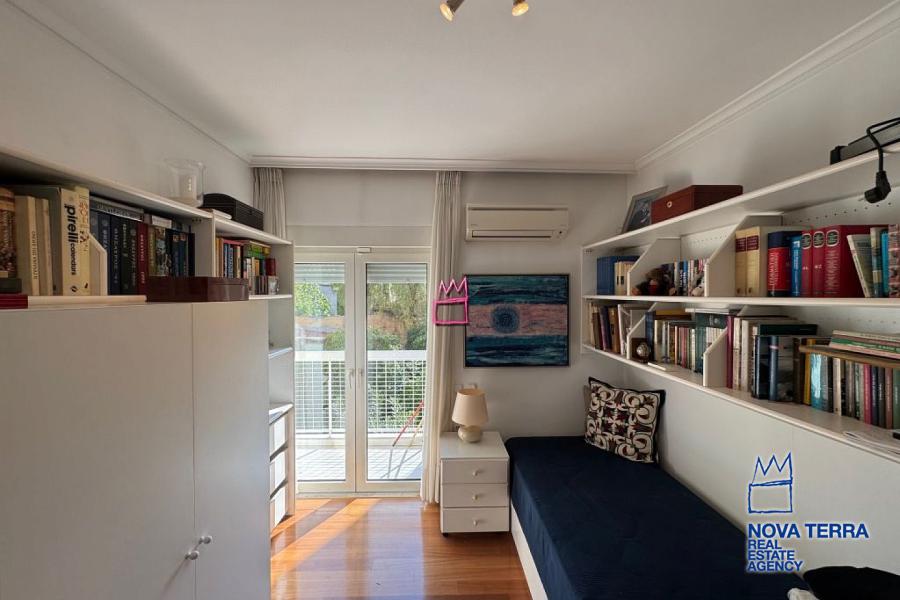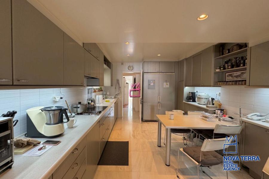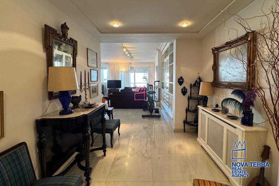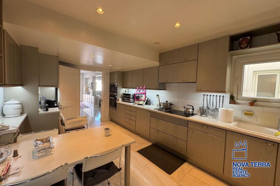 Μπαίνοντας μέσα συναντάμε έναν ευρύχωρο χώρο που φιλοξενεί το σαλόνι με τζάκι και Πεντελικό μάρμαρο στα δάπεδα και τραπεζαρία. Απολαμβάνεις από το μεγάλο μπροστινό μπαλκόνι την θέα προς την Ακρόπολη και το Λυκαβηττό. Συνεχίζοντας συναντάμε μια ευρύχωρη κουζίνα πλήρως εξοπλισμένη με ηλεκτρικές συσκευές Miele. Το διαμέρισμα έχει 4 υπνοδωμάτια και εκ των οποίων το ένα είναι master, έχει άλλο ένα μπάνιο και w/c για τους καλεσμένους.