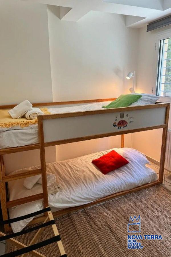 Διαθέτει πόρτα ασφαλείας, κουφώματα αλουμινίου με σιτες, τρία aircondition.