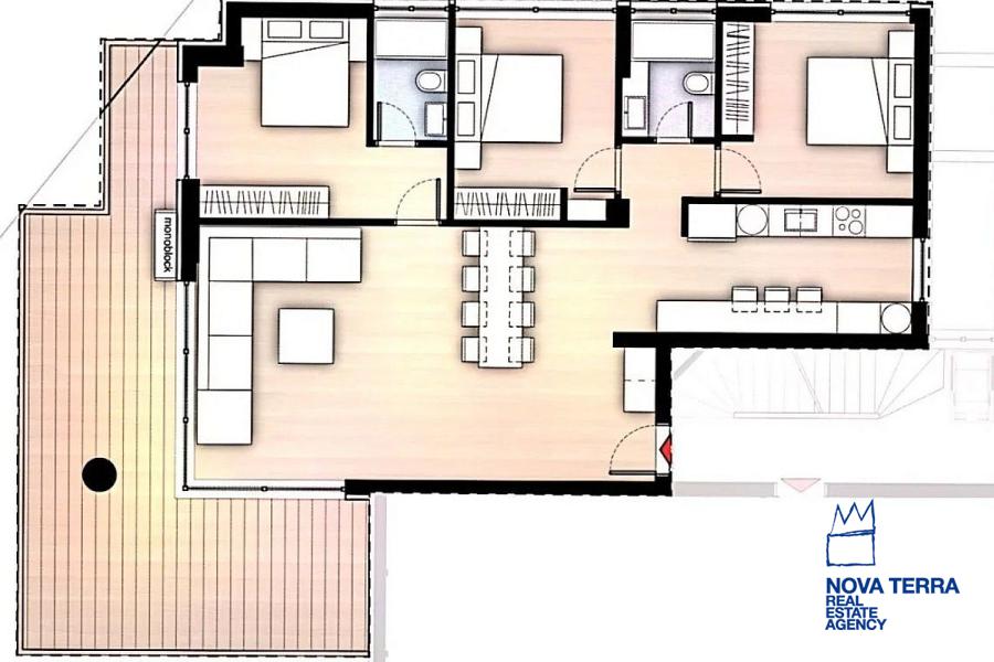 Αποτελείται από τρία υπνοδωμάτια, εκ των οποίων το ένα είναι master, και δύο μεγάλα μπάνια με ντουζιέρα.
